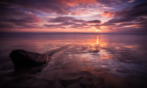 My father and I grabbed Penny (The Dog) and headed down to Oceanside Beach. The Tide was so strange as it was a low tide and a new moon. It was like being at a lakeside with the occasional boat wake. The water was so still and clear. you could see the sea-life and rocks clearly beneath the surface. Penny (my dog) had a great time romping around in the water and playing in the sand with a stick she found. I setup my Camera, Filters, and Remote and took penny down to the water and ran a set of 7 minute exposures. I didn't expect much out of this sunset as the clouds were seemingly pretty thick. But it didn't disappoint and I was able to capture a surprising light show.